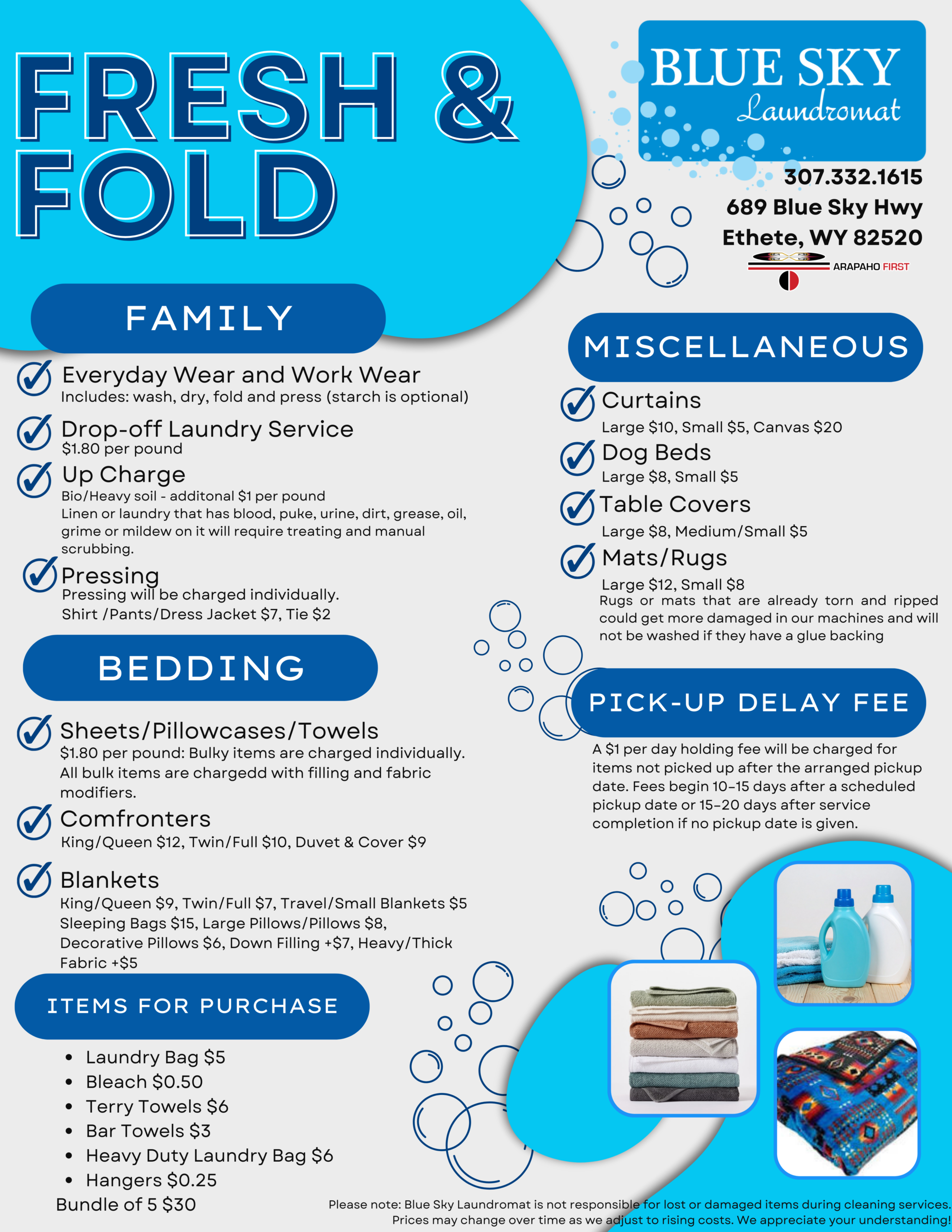 Blue Sky Laundromat is built on hard work, reliability, and local pride. We strive to keep our machines running efficiently, our space clean and well-maintained, and our service dependable. Whether you are washing for your household, your job, or your business, we are here to make the process simple and accessible.