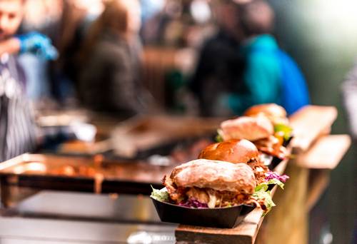 Close up image of a selection of freshly flame grilled burgers in a row on a wooden bar counter at a London street food market. The burgers are sandwiched between glazed buns, and presented on beds of fresh green lettuce and stuffed with melted cheese and red onion. Colour image with copy space and beautiful bokeh background.