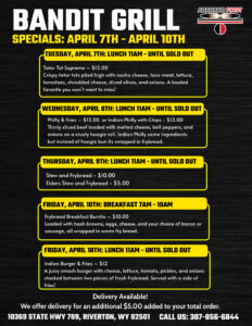 Date Apr 07 - 10 2026 Time All Day Bandit Grill Specials Share this event + Add to Google Calendar + iCal / Outlook export 00 days 00 hours 00 minutes 00 seconds